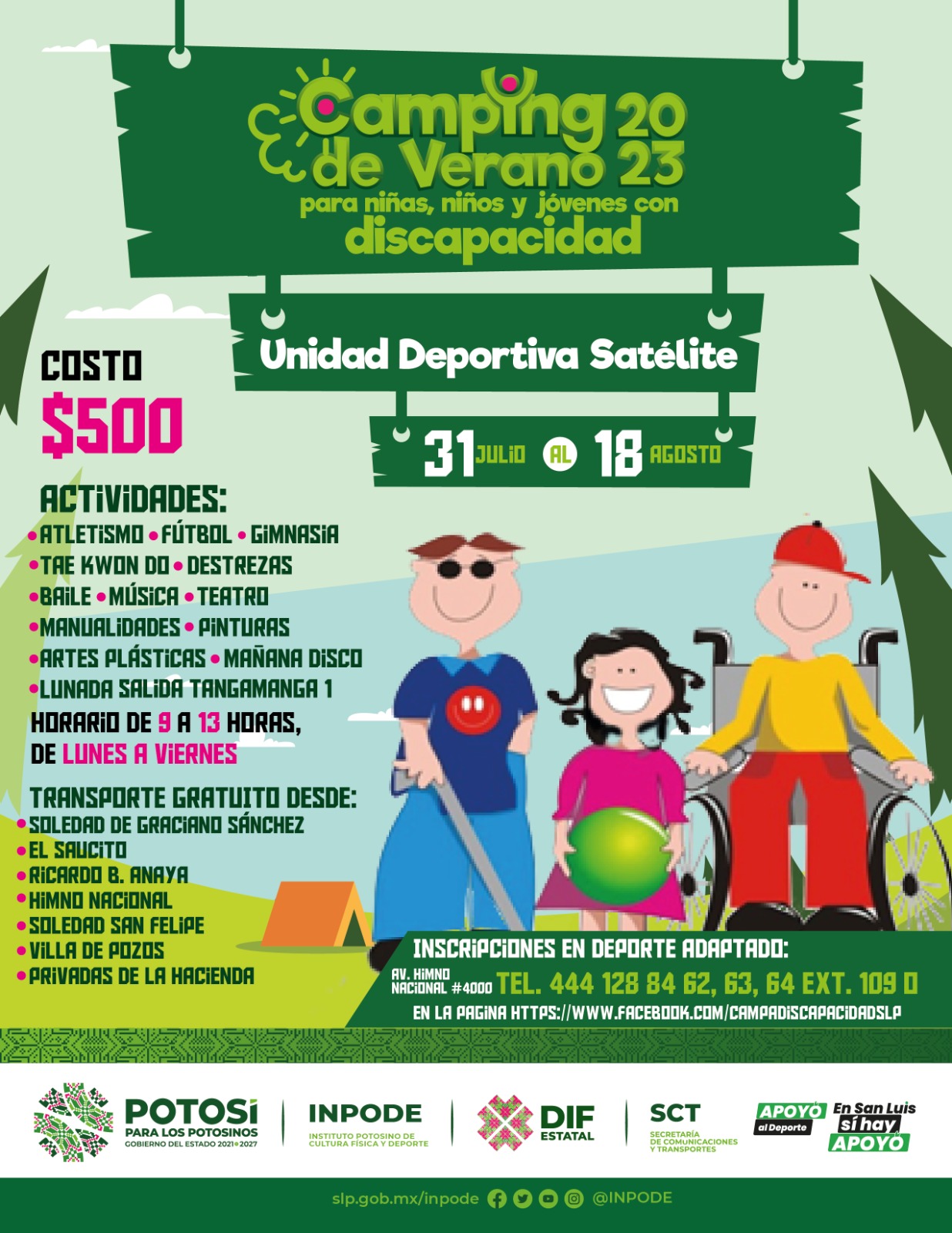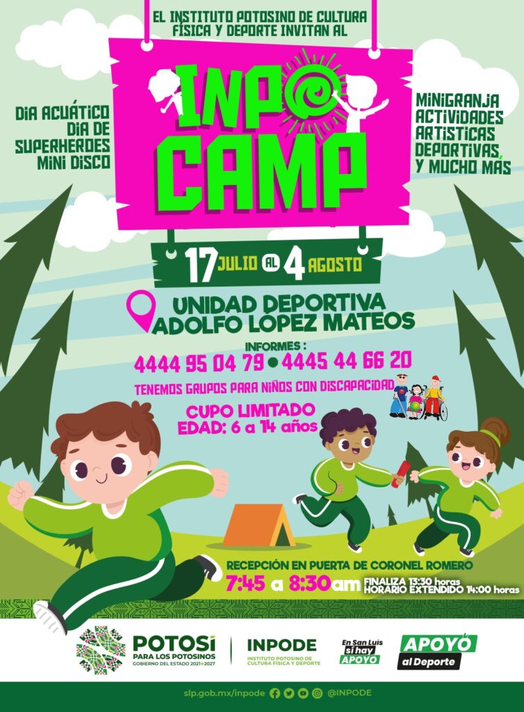 El titular de la dependencia, Joaquín García Martínez, dijo que la instrucción del Gobernador Ricardo Gallardo Cardona es ofrecer a las y los niños potosinos actividades deportivas, acuáticas y artísticas, con el campamento de verano inclusivo Inpocamp del 17 de julio al 4 de agosto de lunes a viernes, en la Unidad Deportiva Adolfo López Mateos, para niñas, niños y jóvenes de entre 6 y 14 años, de 7:45 a 13:30 horas, con posibilidad de horario extendido hasta las 14:00 horas. La cuota de recuperación es de mil 200 pesos. Informes a los teléfonos 44 44 95 04 79 y 44 45 44 60 20.