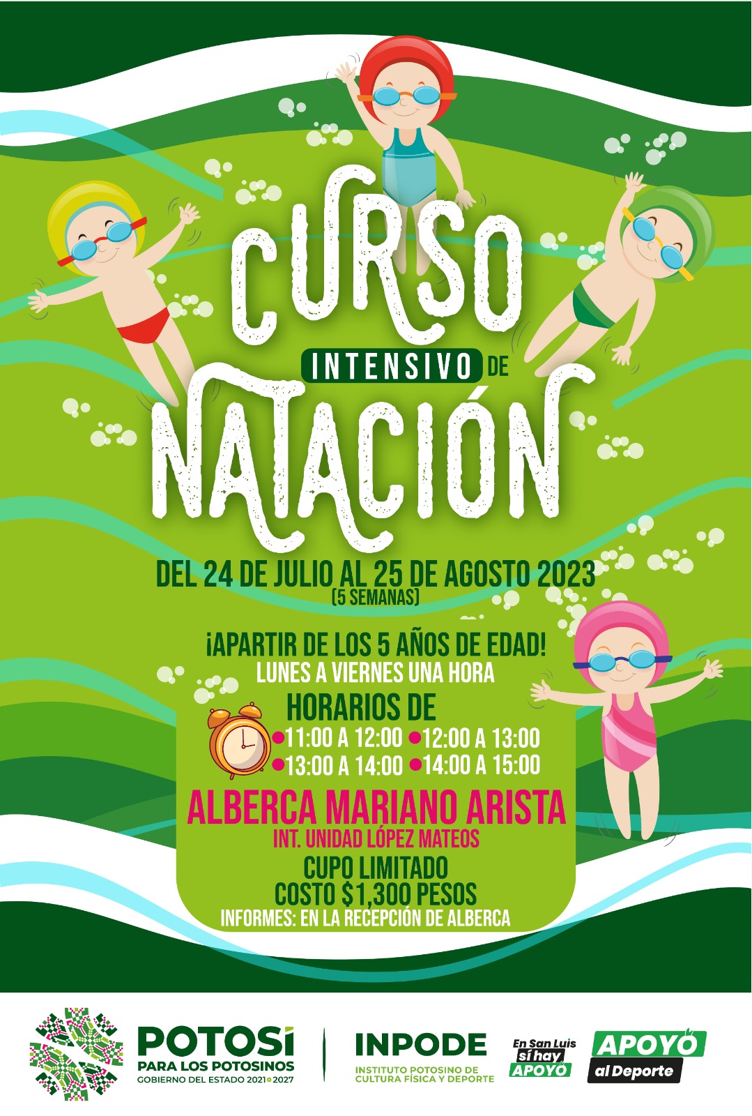 Finalmente, dio a conocer que se tendrá un curso de natación intensivo del 24 de julio al 25 de agosto, en las instalaciones de la alberca olímpica Mariano Arista, de lunes a viernes, con una hora diaria de clases, eligiendo cualquiera de los horarios: de 11:00 a 12:00, 12:00 a 13:00, 13:00 a 14:00 y 14:00 a 15:00 horas, el costo de la inscripción es de mil 300 pesos. Para mayores informes 44 48 15 43 36.