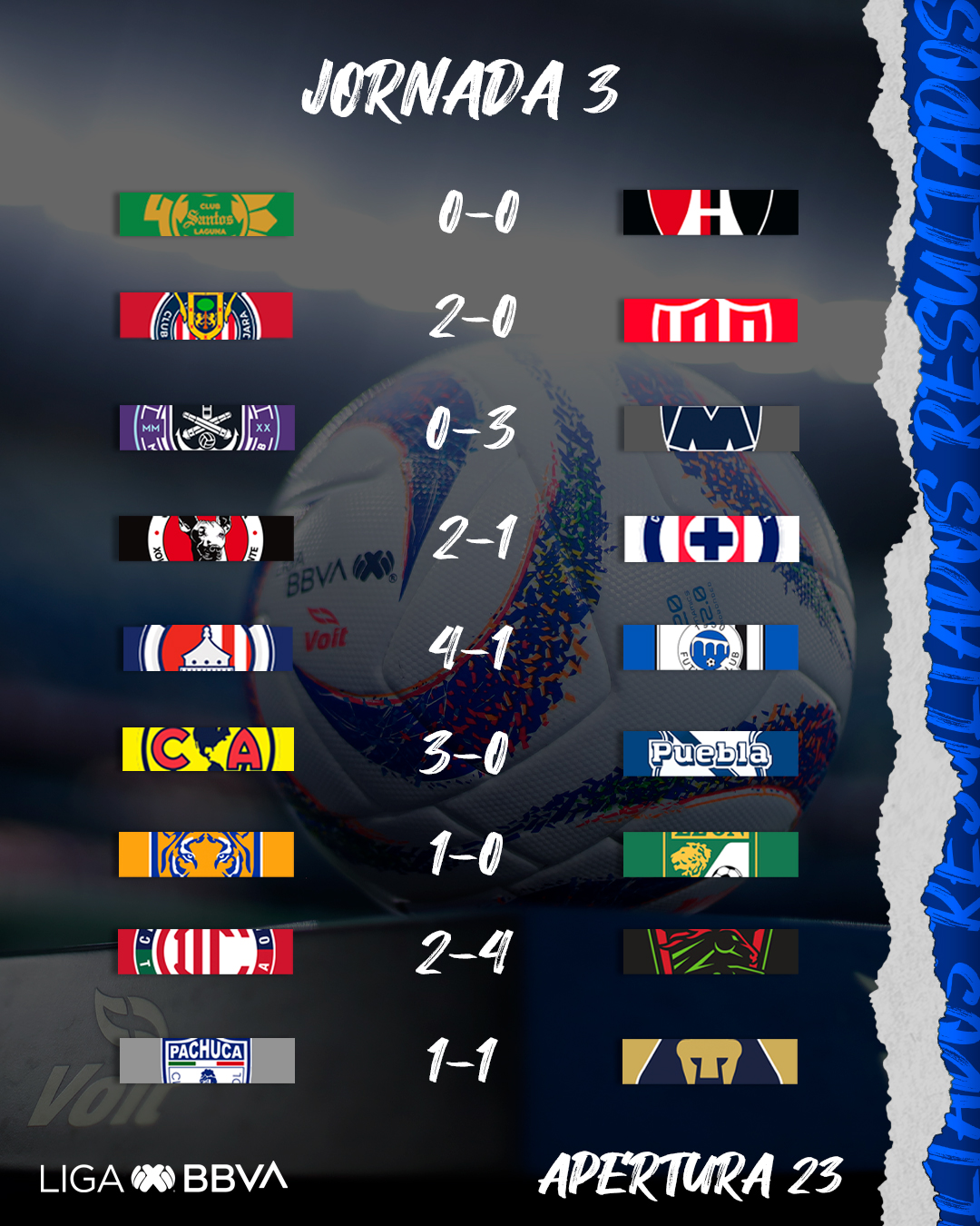Las Águilas, por su parte, sumaron su primer triunfo tras un espectacular triunfo ante el Puebla por 3-0 en el estadio Azteca. Mientras que, Cruz Azul sumó su tercera derrota y sigue en el fondo de la tabla de posiciones con cero unidades.