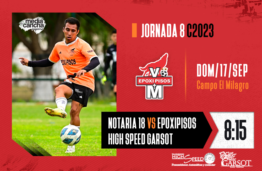 15 de septiembre 2023.- Partidazo el que nos espera este domingo, uno de los más atractivos del torneo sin duda y es que Epoxipisos HighSpeed Garsot, actual campeón y quien marcha de líder general invicto, enfrenta este domingo al equipo de Notaría 18 quien es uno de los serios candidatos al título y que por ahora marcha en el segundo peldaño detrás de los Lobos con solo un gol de diferencia entre ambos.