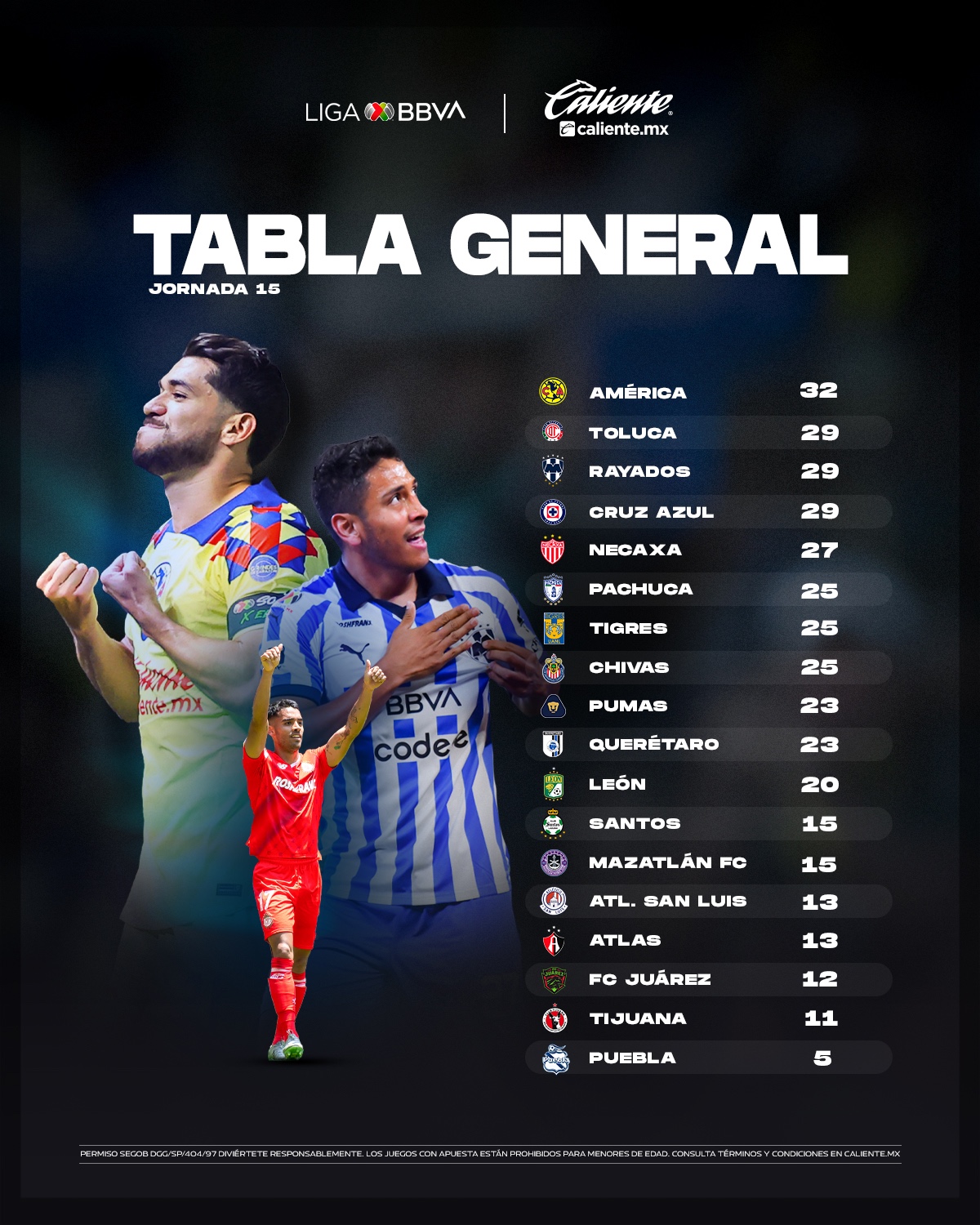 Terminó la antepenúltima jornada del Clausura 2024 y América lidera la tabla de posiciones con 32 unidades tras derrotar con autoridad al Toluca. Los Diablos, quedaron en segundo lugar con 29 puntos, mismos que Monterrey y Cruz Azul. Los últimos dos sitios de la clasificación directa les pertenecen al Necaxa y al Pachuca con 27 y 25 puntos respectivamente.