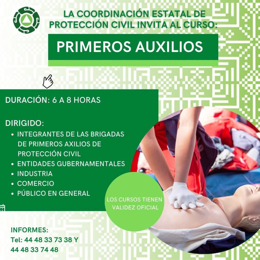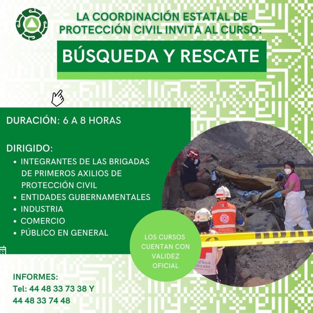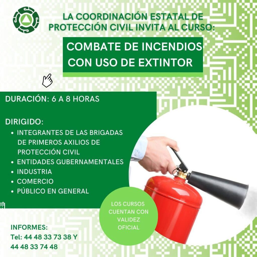 Los cursos tienen una duración de seis a ocho horas y abordan importantes temas en: primeros auxilios, búsqueda y rescate, evacuación de inmuebles y prevención y combate de incendios con uso de extintor. Las y los interesados pueden recibir más información en Calle Lago Danés 100, Fraccionamiento Los Lagos, Delegación Villa de Pozos, a los teléfonos 01(444) 833-73-38, 8 33-74-48, 814-30-28 y 814-07-72 o al correo capacitacionpcslp@gmail.com.