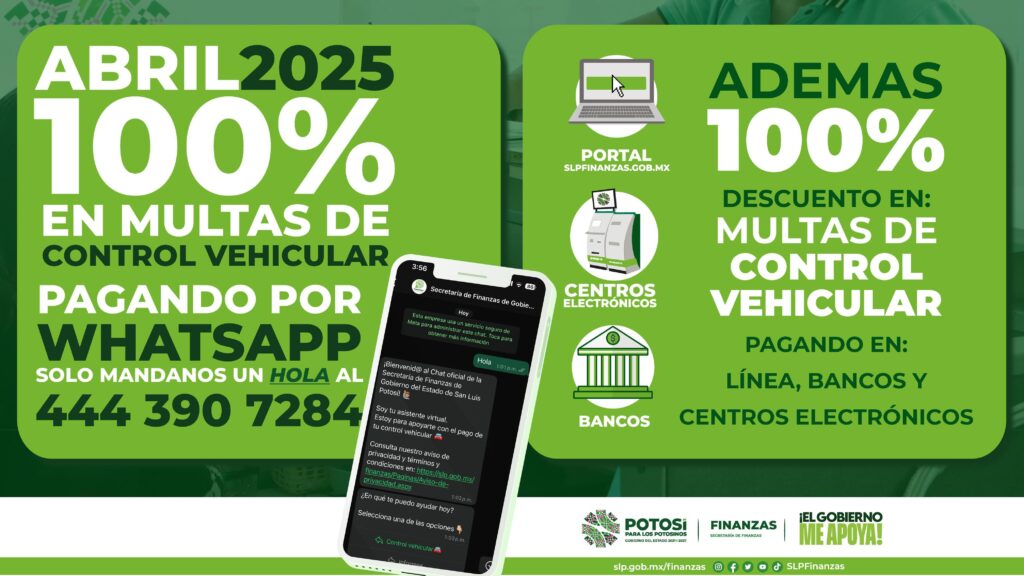 La Secretaría de Finanzas de Gobierno del Estado de San Luis Potosí (Sefin) lanzó el programa de descuentos en el pago de multas de control vehicular durante abril, que será del 100 por ciento de descuento en pagos a través de whatsapp, en línea, centros electrónicos y bancos, lo que facilitará la regularización de contribuciones mediante herramientas digitales.