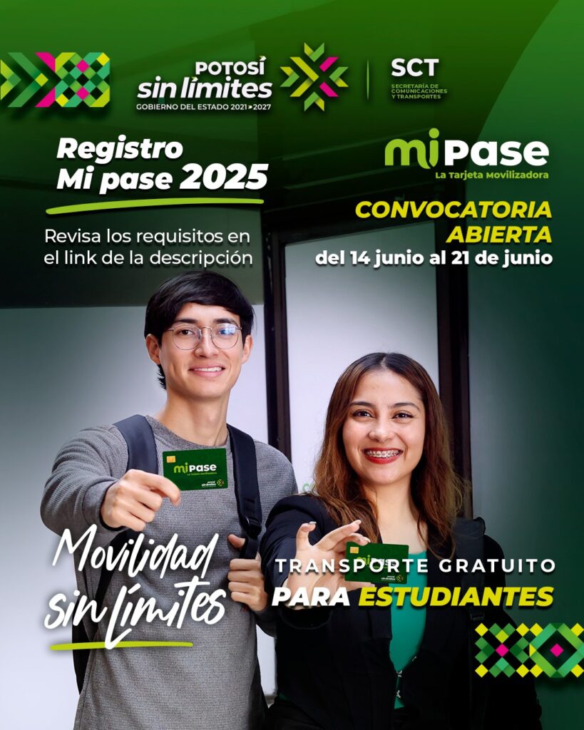 El Gobierno del Estado de San Luis Potosí inicia el registro 2025 del programa “Mi Pase” como parte de su política de apoyo a la educación y a una movilidad sin límites. A través de la Secretaría de Comunicaciones y Transportes (SCT) del 14 al 21 de junio se abrió el registro para universitarios de nuevo ingreso o en renovación.